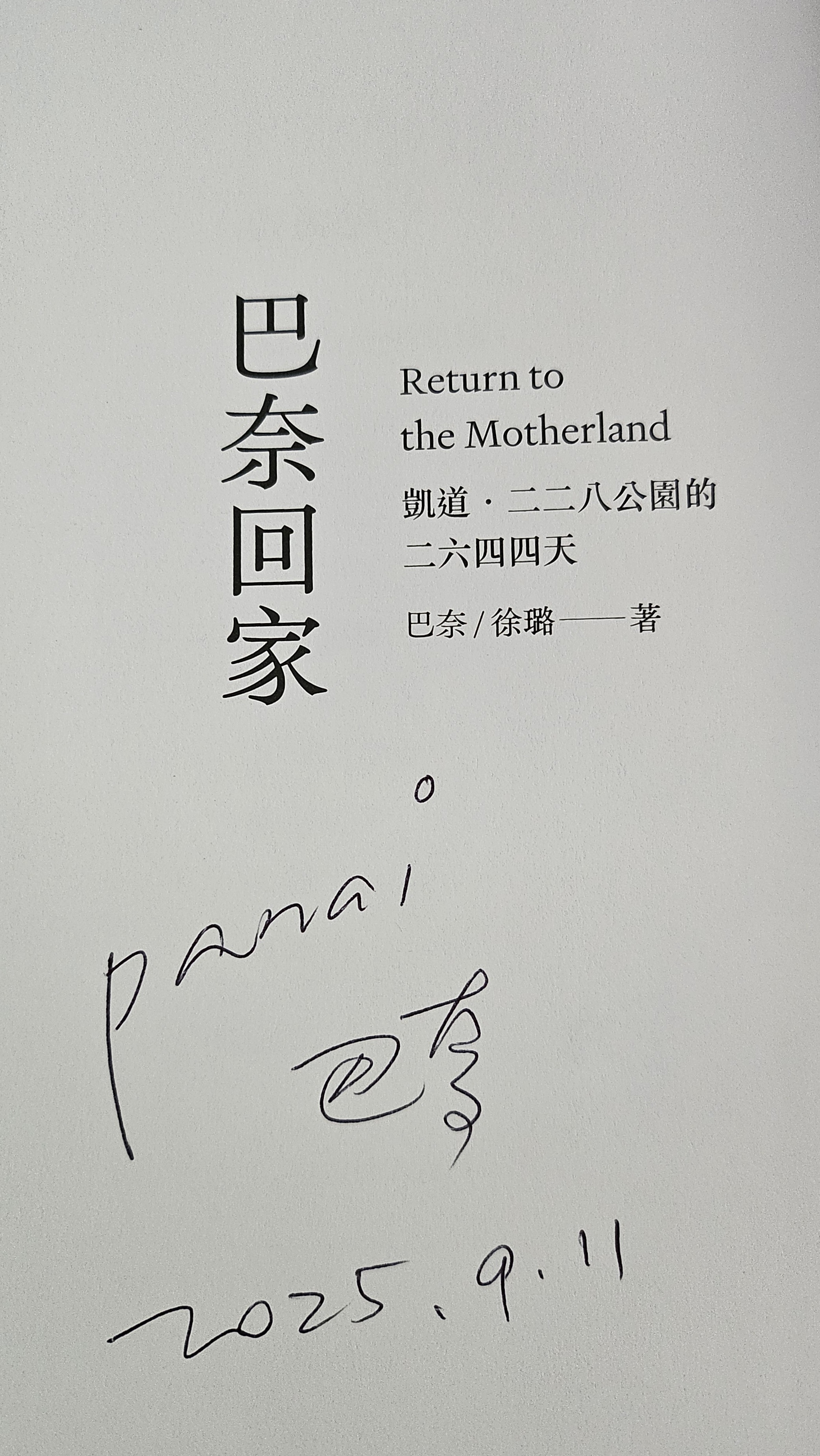 音乐会结束后,我和朋友试图挑选一些能够比较平安地带回中国大陆的东西,在专辑《夜婆》和书《巴奈回家》之间犹豫再三,选择了相对安全的《巴奈回家》。十分不能免俗地,请巴奈在书上为我们签了名。